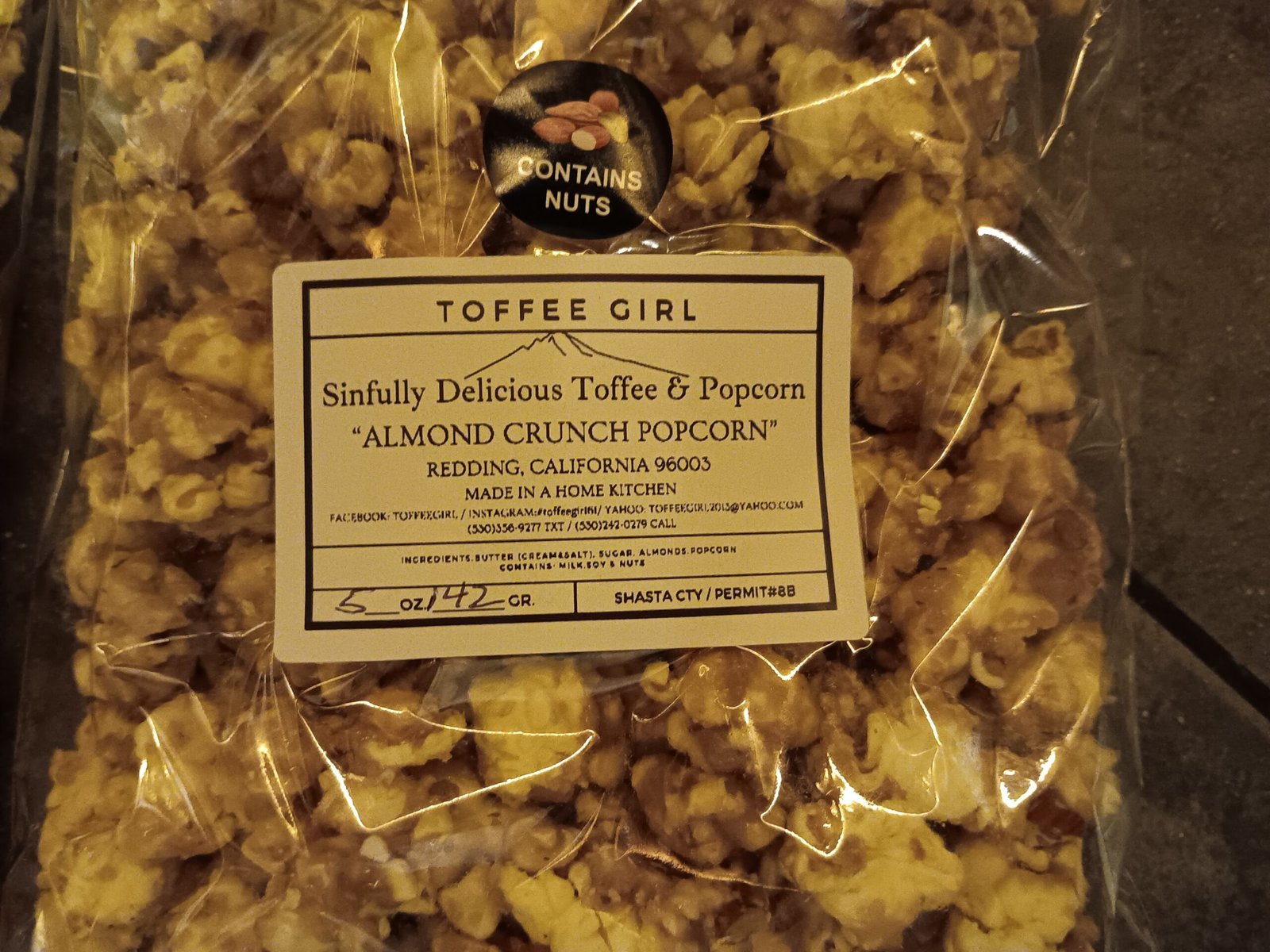 As a Cottage Food Operator in Shasta County (#8B), I get to share all this goodness directly with you- whether you need a small treat-yourself order or a big wholesale batch. You can find my toffee and popcorn in 5 locations across Redding & Cottonwood, plus at local Farmers Markets, Big Events, Weddings, Birthdays and anywhere people appreciate a great snack. Whether it’s a party, a gift, or a treat-yourself moment, I’m happy to make it happen, just give me a call !